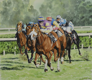 2020Het gaat razendsnel en om de spanning van het spel. De ongelooflijke souplesse kun je nog waarnemen, maar niet de spierbeweging of de pracht van het zweefmoment. Maar kijk naar dit schilderij en je hoort ze en je voelt de warmte van die prachtige augustusdag in Wolvega. Dit schilderij haalde in 2025 de eerste plaats in de categorie stilleven/bloemen/dieren van de Watercolor Golden Brush 2025 wedstrijdtentoonstelling In hetzelfde jaar haalde het de vierde plaats in de categorie 'Dieren realisten' van de World Art Awards 2025.